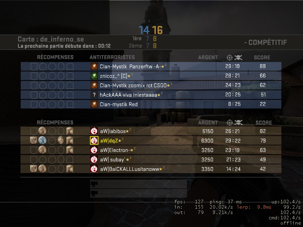 Match  - Counter Strike GO - vs. Clan Mystik CS.GOInformations | Opponent : | Clan Mystik CS.GO | Website : | Visit | Type : | ESL Europe 5vs5 | Date : | 08/07/2012 On 22:45 | Our Line Up : | Electron - BaiCKALLL - subay - labibos - dqZ | Their Line Up : | hAckA - zoomix - panzerftw - znicoz -red | Score : | 16 : 14 | Comments | http://www.esl.eu/eu/csgo/5on5/beta_ladder/match/26519509/ | Membres disponible pour cette war : | | | Return On Wars lists