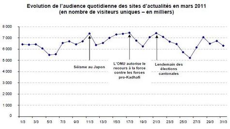 Au mois de Mars 2011, les sites d’actualité enregistrent une progression de 16% de leur audience quotidienne par rapport à l'année 2010, durant la même période temporelle donnée.