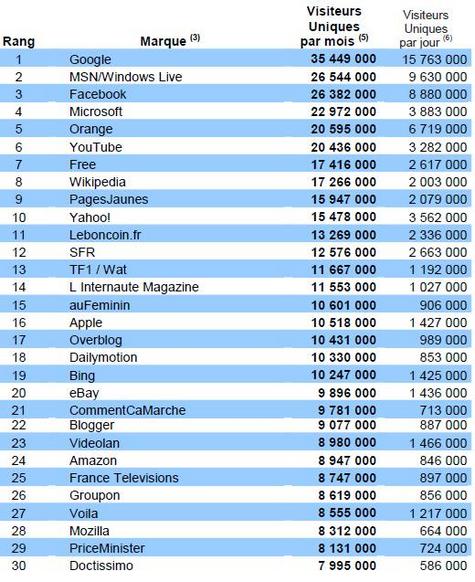 Médiamétrie a publié il y a quelques jours son classement mensuel des sites internet en France pour le mois de Mars 2011. Le classement est ainsi basé sur le nombre de visites uniques recensées sur les sites web, et une "visite unique" est caractérisée par le fait qu'un internaute ait navigué au moins une fois sur un site spécifique pendant la période donnée.