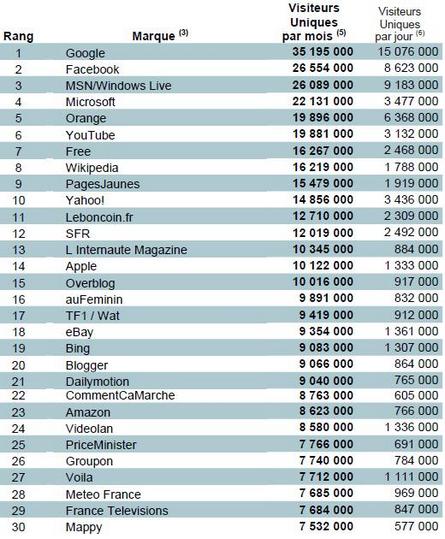 Passons enfin au classement des 30 sites web les plus visités dans l'Hexagone, sachant que les "applications internet" sont incluses. Le nouvel indicateur, à savoir le nombre de visiteurs uniques par jour, est également présent.