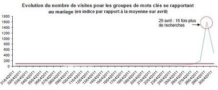 L’évolution des recherches par mots-clés liés à l’évènement, tels que "mariage", "kate middleton", "william", "pippa middleton" ou encore "royal wedding", a pu permettre de confirmer/valider l'hypothèse selon laguelle l’intérêt des internautes s’est surtout concentré au moment de l’évènement. La veille du mariage, le jeudi