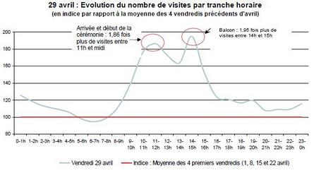 Médiamétrie/eStat analyse également l'évolution du trafic sur certains sites d'actualités ou associés aux médias. Le rapport a pu mettre en évidence l’impact du mariage du Prince William et de Kate Middleton en Angleterre, qui a suscité un réel engouement sur la toile, avec un pic de fréquentation pour la journée du 29 Avril. L’afflux massif de visites supplémentaires s’est essentiellement concentré en fin de matinée et au début de l’après-midi :