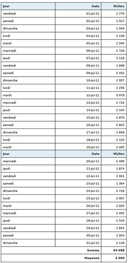 En moyenne, durant le mois de Juillet 2011, 2096 visiteurs uniques ont navigué quotidiennement sur notre site web, c'est 500 de plus qu'au mois de Juin.