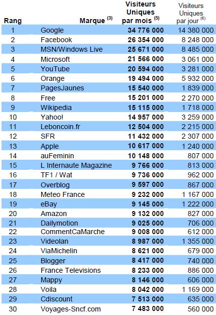 Médiamétrie a publié la semaine dernière son classement mensuel des sites internet en France pour le mois de Juillet 2011. Le classement est ainsi basé sur le nombre de visites uniques recensées sur les sites web, et une "visite unique" est caractérisée par le fait qu'un internaute ait navigué au moins une fois sur un site spécifique pendant la période donnée.