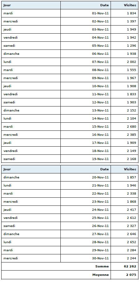 Les chiffres pour le mois de Novembre 2011 sont désormais disponibles.