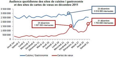 Chaque jour, plus de 600000 internautes en moyenne ont consulté au moins un des sites de la sous-catégorie "Cartes de voeux", ces derniers ayant enregistré 2 pics d’audience au cours du mois : le 24 Décembre dernier, puis le 31.