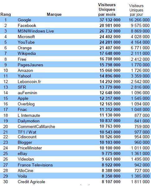 Passons enfin au classement des 30 sites web les plus visités dans l'Hexagone, sachant que les "applications internet" sont incluses. Le nouvel indicateur, à savoir le nombre de visiteurs uniques par jour, est présent.
