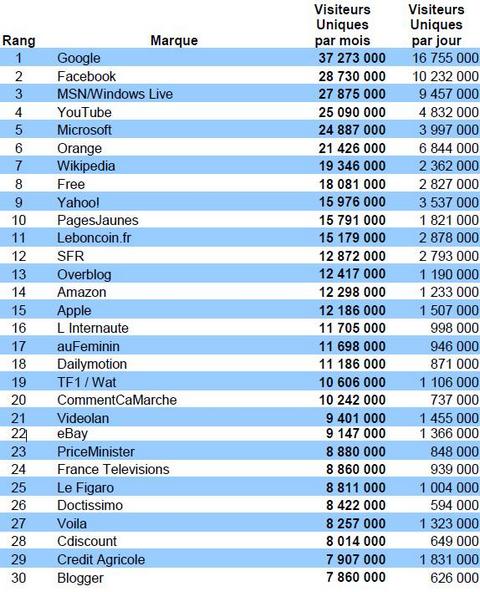 Passons enfin au classement des 30 sites web les plus visités dans l'Hexagone, sachant que les "applications internet" sont incluses. Le nouvel indicateur, à savoir le nombre de visiteurs uniques par jour, est également présent.