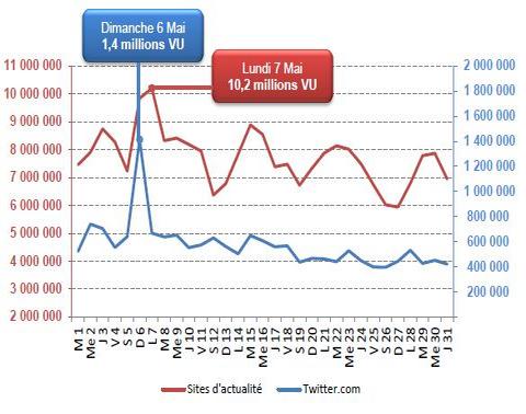 En pleine journée d'élections, soit le dimanche 6 Mai, le site Twitter.com a atteint un record de fréquentation avec 1,4 million de visiteurs uniques dans l'Hexagone, soit 2,5 fois plus de visiteurs que la moyenne observée durant ce mois-ci.