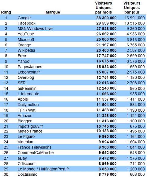 Passons enfin au classement des 30 sites web les plus visités dans l'Hexagone, sachant que les "applications internet" sont incluses. Le nouvel indicateur, à savoir le nombre de visiteurs uniques par jour, est également présent.