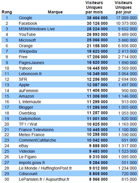 Passons enfin au classement des 30 sites web les plus visités dans l'Hexagone, sachant que les "applications internet" sont incluses. Le nouvel indicateur, à savoir le nombre de visiteurs uniques par jour, est également présent.