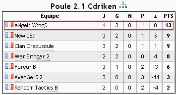 AvenGers 2. Une victoire nette et sans bavure (5-0), qui nous permet de reprendre la tête au classement général. Pas de playday la semaine prochaine.