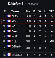 Clan Crepuscule. Il a été remporté par notre formation sur le score de 3 à 0 (en réalité, nous menions 1-0 et avons gagné les deux points restants après décision des administrateurs de la ligue). Nouvelle victoire lors de cette saison, qui nous permet de remonter encore au classement, et de revenir à quelques points seulement des premiers, à savoir les