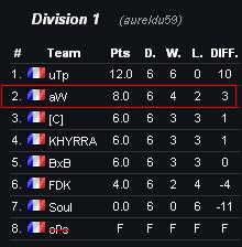 Notre effectif a donc terminé 2ème, avec 5 victoires et 2 défaites, ce qui nous qualifie automatiquement pour l'arbre des playoffs :