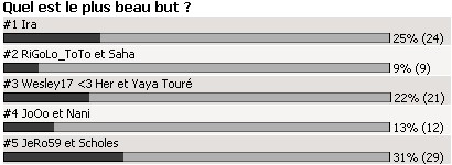 "Je vous ai présenté il y a quelques jours le but acrobatique me permettant de concourir lors de la nouvelle édition du TOP GOAL ESL, à savoir une reprise de volée acrobatique réalisée par Paul Scholes, servi par Rooney sur corner. Je vous remercie pour votre soutien, le résultat final me donnant victorieux avec 31% des votes. Je dédie cette victoire à l'équipe